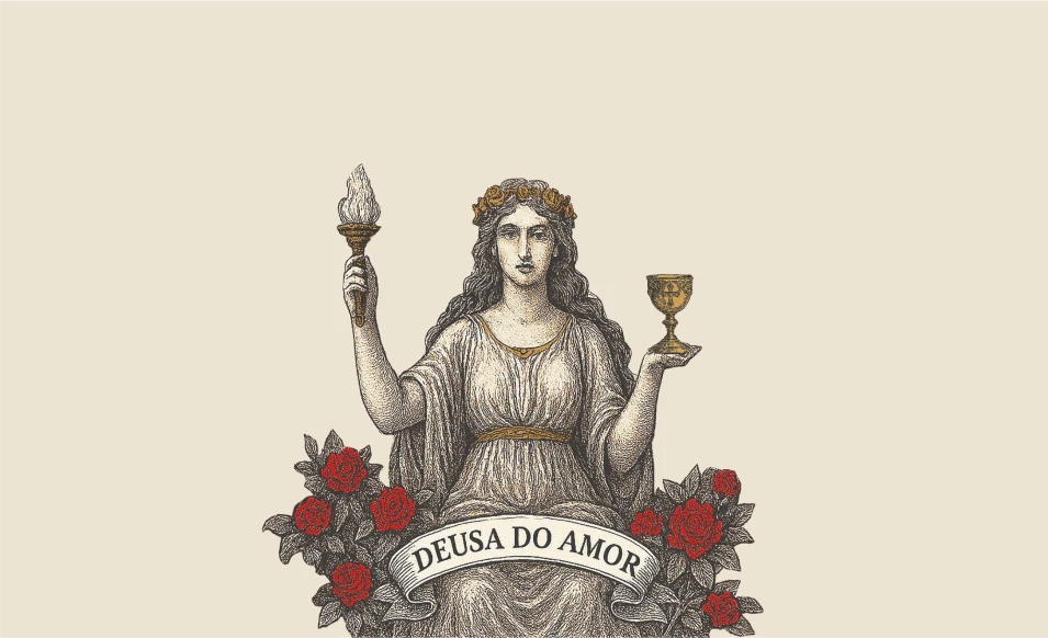 É a força que sustenta os encontros. Ela segura a tocha porque o amor ilumina até os caminhos mais escuros, e ergue a taça porque todo amor merece ser celebrado. Representa a coragem de amar apesar do medo, de abrir o coração quando seria mais fácil fechá-lo.